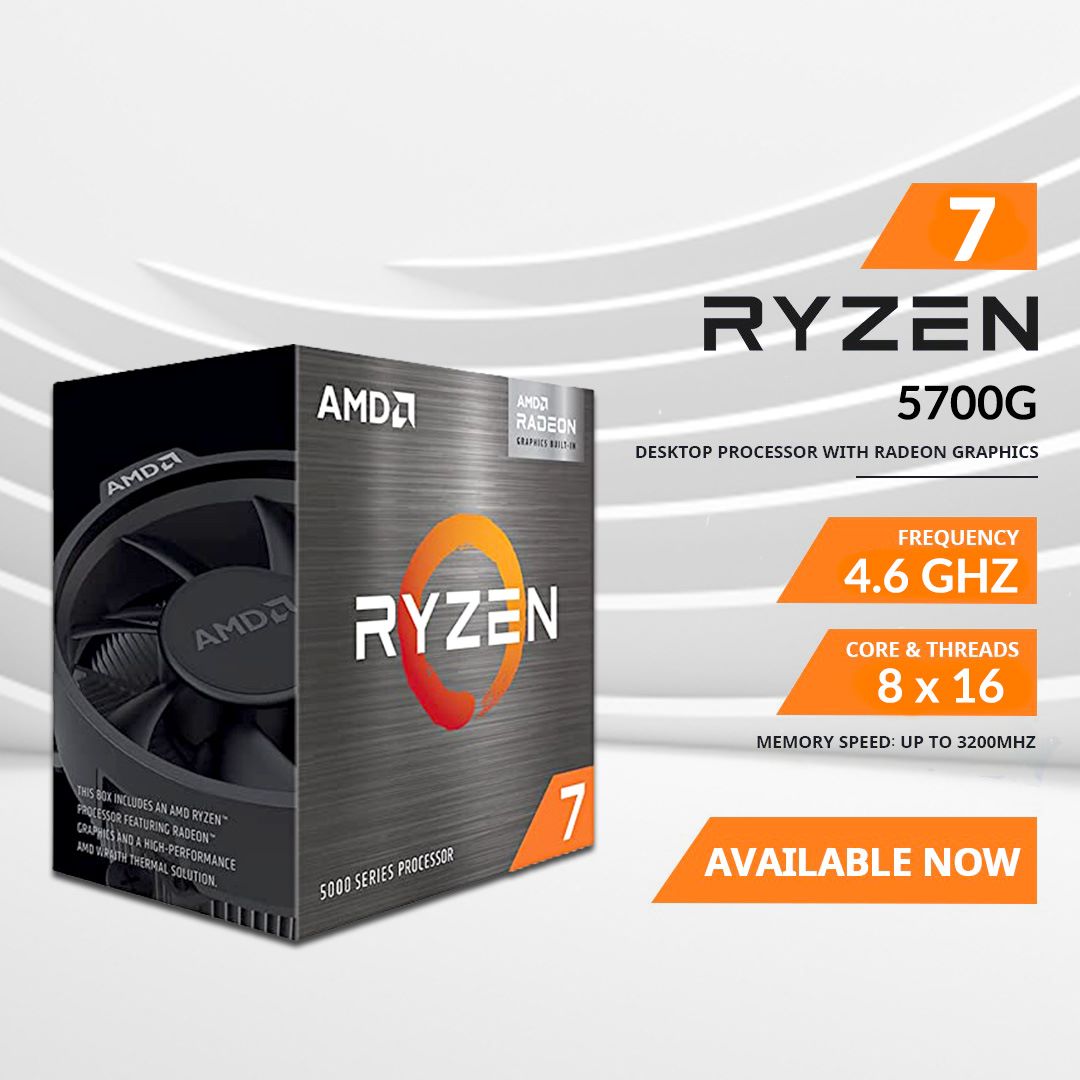 AMD Ryzen 7 5700G Processor with Radeon Graphics, a powerhouse of computing performance and visual excellence. This cutting-edge processor redefines what's possible in the realm of computing, delivering a seamless fusion of high-speed processing and exceptional graphics capabilities.At the heart of this processor lies an array of impressive features that elevate your computing experience to new heights. With a base frequency of 3.8GHz and the ability to reach a maximum turbo frequency of 4.6GHz, the Ryzen 7 5700G handles everything from everyday tasks to demanding applications with remarkable efficiency. Its 8 cores and 16 threads provide the multitasking prowess you need, ensuring smooth and responsive performance even when juggling numerous tasks simultaneously.The processor's memory specifications boast support for DDR4 memory with a maximum speed of 3200MHz, offering lightning-fast data access and seamless multitasking capabilities. With a maximum of 2 memory channels, this processor is primed to handle memory-intensive applications and provide a smooth user experience.